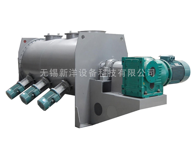 該機型由傳動機構、臥式筒體、犁刀、飛刀四部分組成。物料在犁刀作用下沿筒壁作對流運動,當物料流經飛刀時被高速旋轉的飛刀拋灑,從而在較短時間內達到均勻混合。能滿足大多固液混合以及造濕粒、干燥等復合工藝。