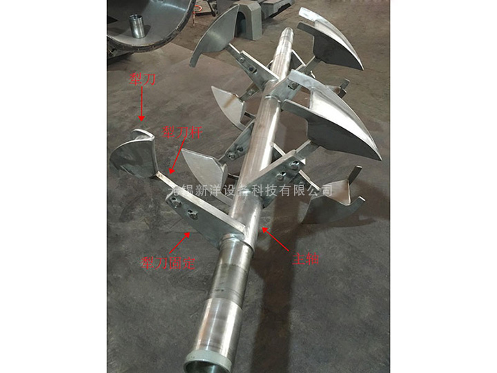 3、犁刀組軸:犁刀根據容積大小安排犁刀數據,安裝在主軸上,在筒體內作圓周運動混合物料。