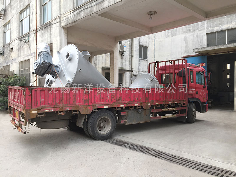 3、螺旋部分:筒體內兩只非對稱排列的螺旋作自、公轉行星運動時,在較大范圍翻動物料,使物料快速達到均勻混合。