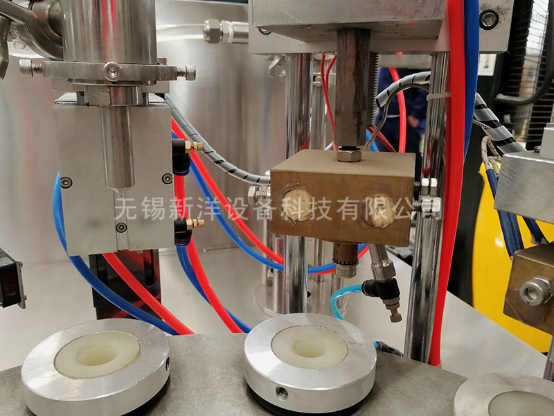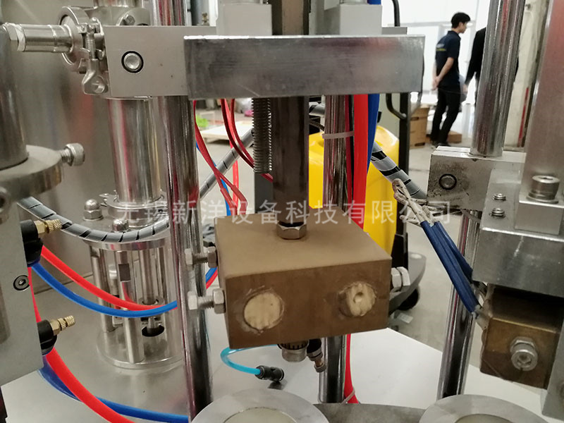 該機的灌裝、封口、壓齒、換位、定位等均采用機電、光電、氣泵一體化原理,通過凸輪分度機構,換位、定位,氣泵灌裝、封口等動作完成,灌裝、加熱、封口、切尾、頂桿等七個工作程序。所有動作均同一輸出同步完成。保證動作一體化,提高了動作的可靠性和穩定性。